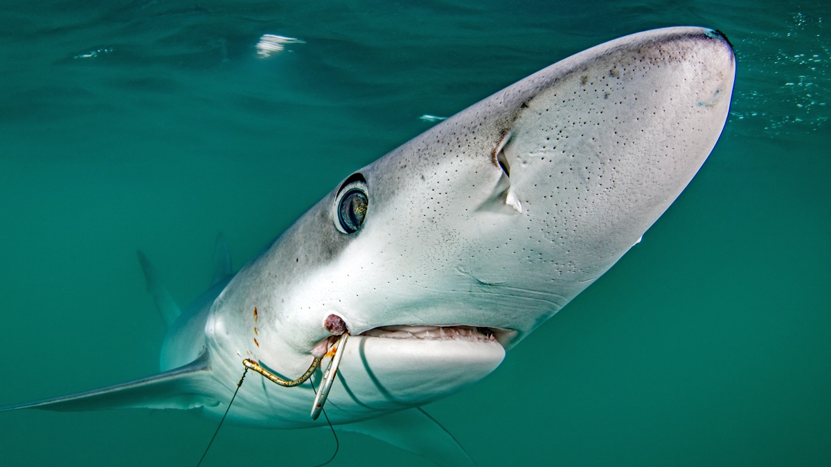 Blauhai mit 2 Langleinenhaken im Maul, © Ron Watkins/Ocean Image Bank